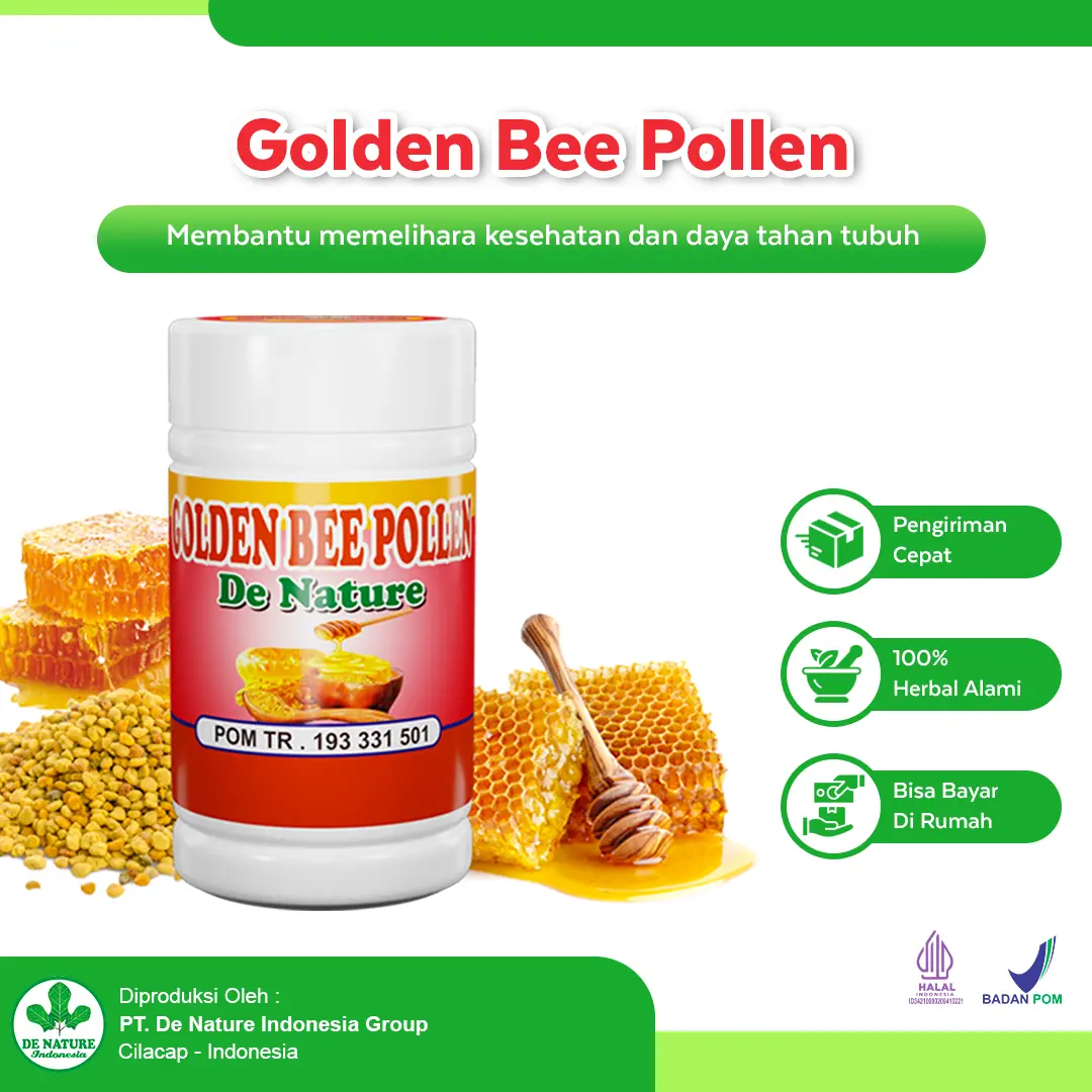 Golden Bee Pollen De Nature bantu memelihara Kesehatan dan meningkatkan daya tahan tubuh. Terbuat dari bahan alami 100%, aman tanpa efek sampaing, sudah teruji secara klinis terdaftar oleh BPOM dan MUI.