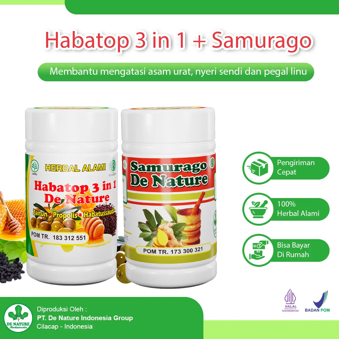 Paket Obat Samurago dan Habatop merupakan kombinasi produk herbal unggulan dari De Nature Indonesia yang diformulasikan khusus untuk membantu mengatasi asam urat tinggi dan nyeri sendi secara efektif. Terbuat dari bahan-bahan alami pilihan yang telah teruji khasiatnya.